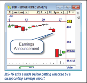 The MS-16 Strategy employs a new indicator called Days to Earnings. This powerful indicator helps us avoid trading into a potentially dangerous earnings report. But the real magic is obtained by using the MS-16 Strategy with the MS-16 Dynamic Scan. This scan pinpoints the stocks that are outperforming the market but have made a significant pullback against the trend.